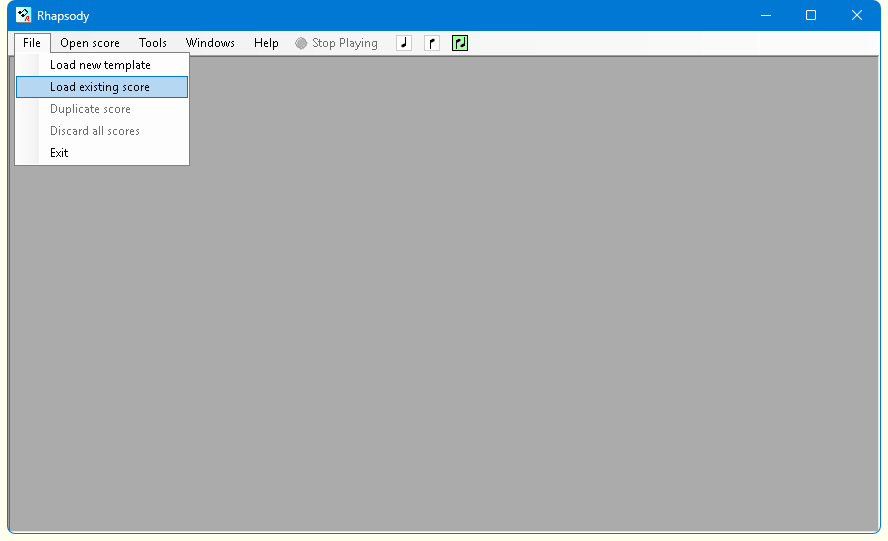 Select the file you want to load. On clicking 'Open' at the bottom of the dialog box the score will load in a window contained within the main Rhapsody window.
