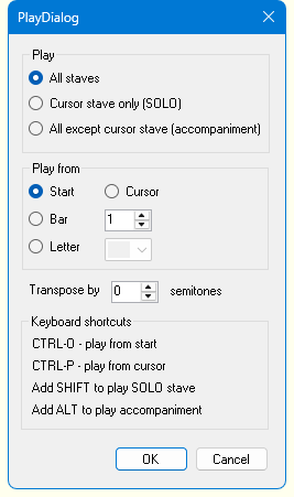 It is worth noting that CTRL-O will play the score from the start and CTRL-P will start playing from the cursor.