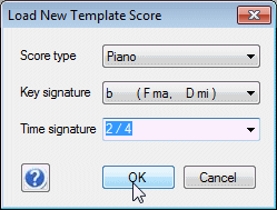 A small dialog box opens which invites you to choose what kind of score you want, its time signature and its key signature. Choose a Piano score in the key of F major (1 flat) with a time signature of 2/4, like this: