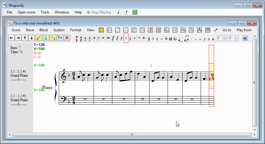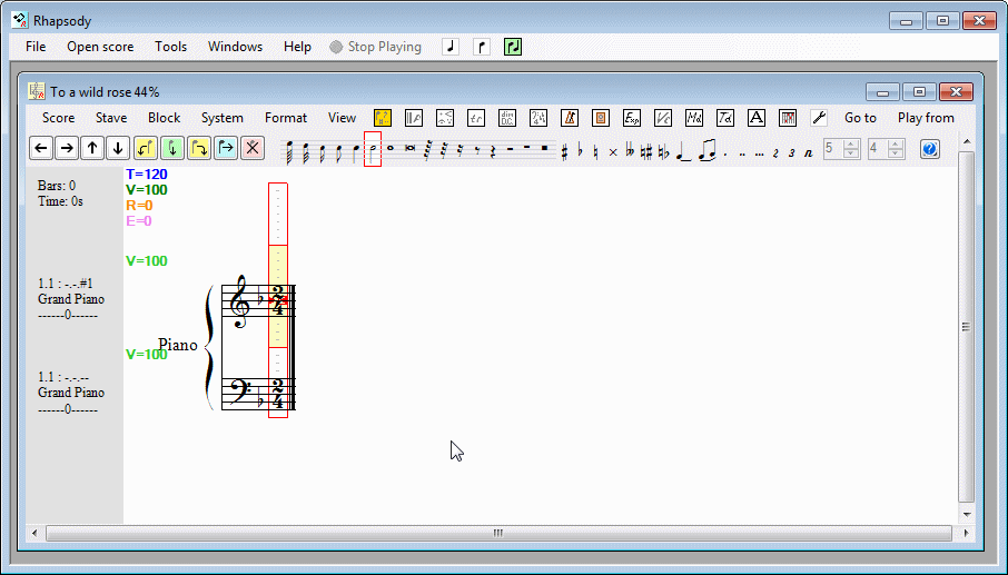 Are you beginning to get the idea now? It is simple really. Select what symbol you want; position the cursor where you want it and click on the correct Insert button. If you are thinking that this is not simple at all and that there must be an easier way, I should like to point out two things. Firstly - entering musical notation is far more complex than typing a document and secondly, VBR does provide numerous shortcuts and other features which you might expect like entering notes from a MIDI keyboard - but it is best to start with the methods that always work and are easiest to remember.