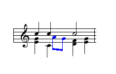 It will be seen that, while the second alto has a crotchet, the first altos must sing a pair of moving quavers. It is a necessary feature of VBR that all notes in the same cluster must have the same duration. In any case, if the crotchet was joined to the quaver, it would look like a quaver anyway. To get over this problem VBR allows you to add what are called 'alternative notes'. They are exactly the same as ordinary notes but all editing operations on them are carried out while pressing the Alt key. In order to distinguish them from proper notes they are printed in a different colour (blue by default). (The only other difference between them and proper notes is that they are not used to determine the timing of notes when played. This does mean that they may not always play correctly.)