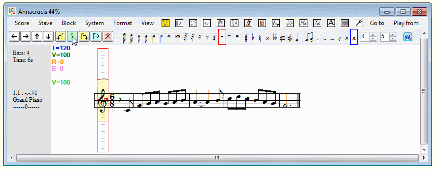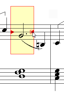 In the chapter on the Quick Edit Buttons we saw how it was possible to improve the appearance of a score by 'kerning' - that is to say, adjusting the widths of the slots to make use of empty space that would otherwise be wasted. It sometimes happens that VBR misses an opportunity. In this case you can kern the slot yourself easily. If you look closely at the cursor you will see that there is a little square handle on the right and edge. You can click and drag this handle to make the slot wider or narrowr.