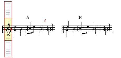You can produce the effect shown at letter B by adjusting the exact positions of the notes manually in the following way. Place the cursor over the note which you wish to move. Pressing Ctrl-9 will nudge the note to the left while Ctrl-0 will nudge it to the rght.