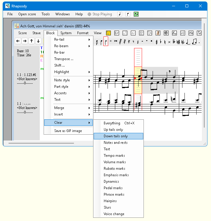 For example, to remove just the alto part from a bar in a scar, mark the relevant bar and choose the menu option 'Block > Clear > Down tails only' as illustrated below.