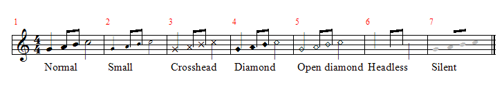 The crosshead style is often used for untuned percussion instruments and the diamond heads give a score a quasi