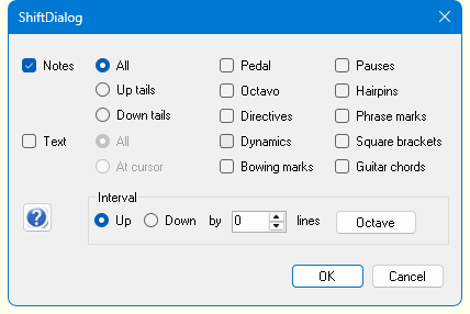 It is very useful to be able to shift all sorts of things as well as notes up and down. To do so, mark a block as usual, then goto 'Block > Shift ...'. The following dialogue box will open.