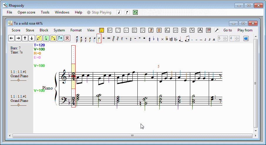 You will also notice that the score contains a large yellow box. This is called the 'cursor' and is where all the editing takes place.