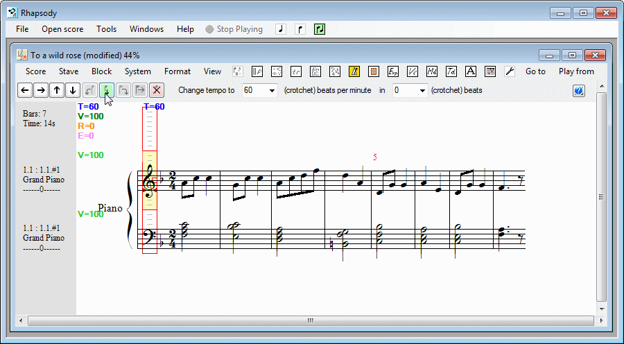 If you try playing the score at this point, you will probably agree that it plays much too fast. This is because we have not entered a tempo directive. To do this, put the cursor over the treble clef; select the tempo group symbol (the one with the metronome); enter the desired tempo in the first box (eg 60 crotchet beats per minute) and click on Insert-At.